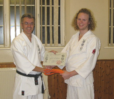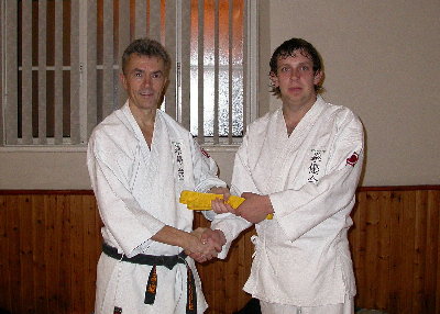 Kyu Grading - December 2008 Alex and Alex both took part in the grading held on the 11 Dcember 2008 in Hedge End. Alex Pordage was successful in achieving his Orange belt and Alex Escudero was awarded his Yellow belt. Both men worked hard during the grading and rightly deserved their new grades. Alex Pordage receiving his Orange Belt from Sensei Nigel Coole. Alex Escudero receiving his Yellow Belt