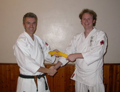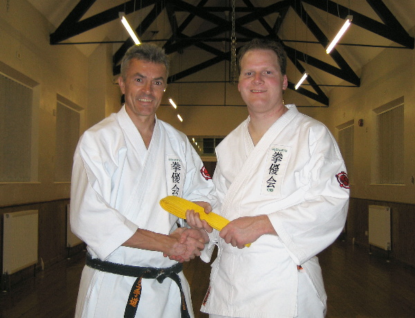 Grading success in Hedge End Congratulations go to Phil Henshall on passing his Yellow Belt grading. The photograph below is of Phil being presented his yellow belt by Sensei Nigel Coole.