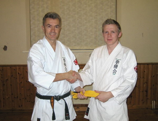 Kyu Grading - June 2009 Sam Hughes passed his first grading on 29 June 2009. Congratulations go to Sam for his achievement. Sam is shown below receiving his Yellow Belt from Sensei Nigel Coole.