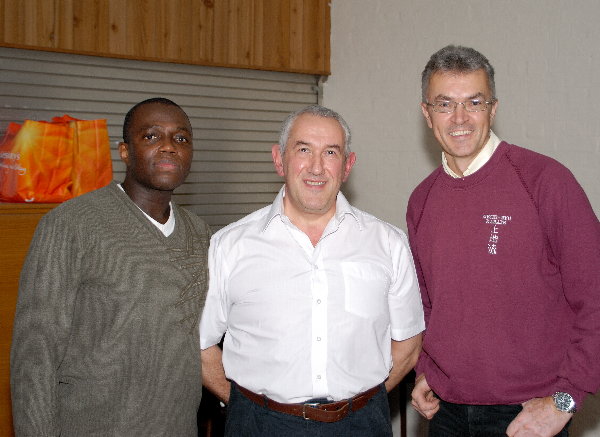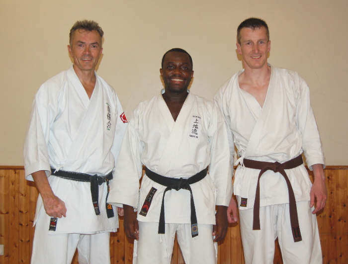 Visit from Senior London Instructor We were delighted to meet Kuda Adams (4th Dan) on 23 August 2007 when he came down from London to train with us. It was really good to meet a Uechi-Ryu Karate practitioner from one of the UK's oldest clubs. Kuda, one of Terry Daly's (6th Dan) senior students, joined in with the regular evening training. Kuda will shortly be opening a new dojo in Wandsworth, London so if you live nearby please feel free to drop him a line - contact details on our UK Clubs page. We hope to reciprocate and to visit London later in the year to train with Terry, Kuda and the other London Uechi-Ryu practitioners. L-R: Nigel Coole, Kuda Adams and Dean Sinclair