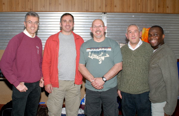 Uechi-Ryu Association (GB) Dan Grading - Oxford November 2008 I was invited to visit the Uechi-Ryu Association (GB) Dan Grading (Brown belt to Black belt) that was held in Oxford on 8 Nov 08 and to join in the training prior to the actual grading itself. I want to pass on my congratulations to those students that passed their grading; to those that were not successful I hope the experience has encouraged you to work even harder at your Uechi-Ryu Karate and to achieving the coverted Uechi-Ryu Karate Black Belt in the not too distant future. Whilst not a member of the GB Association myself (I am a member of the Uechi-Ryu Kenyukai, a student of Master Takemi Takayasu, and through him Master Kiyohide Shinjo) I was made most welcome by everyone present which just proves that Uechi-Ryu Karate is still one big family no matter which association you are part of. It was a genuine pleasure to meet people that I had not met for 25 years - hi Terry and Mick! - and to meet everyone else that I had not met before. After the formal group training was over Kuda Adams, Steve McNally (jnr), Alan Holmes, Duncan Harper and myself spent a very useful couple of hours training together prior to the grading. Coming from 4 different clubs it was really good to see that there were so few differences and that even then they were mainly a matter of personal style. Thanks Guys and I hope to be able to train with you again in the not too distant future. Left to Right: Nigel Coole, Steve McNally (Snr), Steve McNally (Jnr) -------------------------------------- Left to Right: Dean Lowe, Terry Daly, Nigel Coole ------------------------------ Left to Right: Kuda Adams, Mick Pappas, Nigel Coole ----------------------------------- Left to Right: Nigel Coole, Alan Holmes, Duncan Harper, Mick Papas, Kuda Adams. --------------------------------------- Left to Right: Ken Smith, Terry Daly --------------------------------